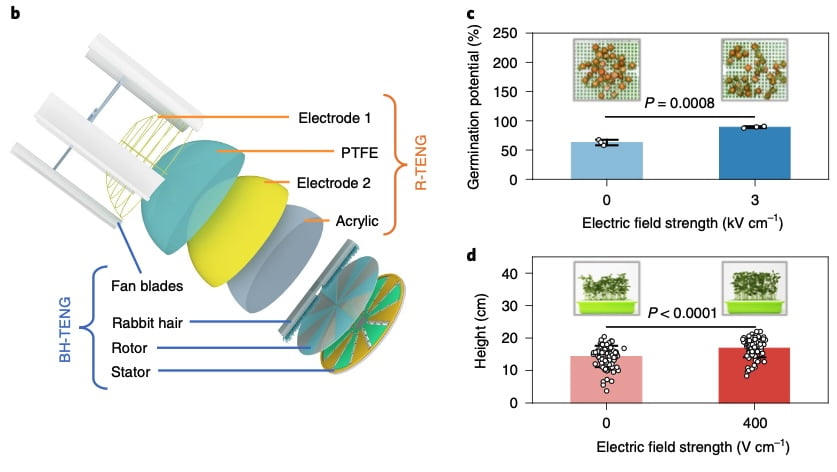 The research introduces a self-powered system designed to enhance crop yields using the ambient energy captured from wind and rain. This system, centered around an all-weather triboelectric nanogenerator (AW-TENG), marks a significant leap towards sustainable and smart agriculture. The AW-TENG device is ingeniously crafted with two main components: a bearing-haired turbine to harness energy from wind and a raindrop-collecting electrode for precipitation. This setup not only captures but efficiently converts mechanical energy from these environmental sources into electric fields, stimulating plant growth in a novel and eco-friendly manner.