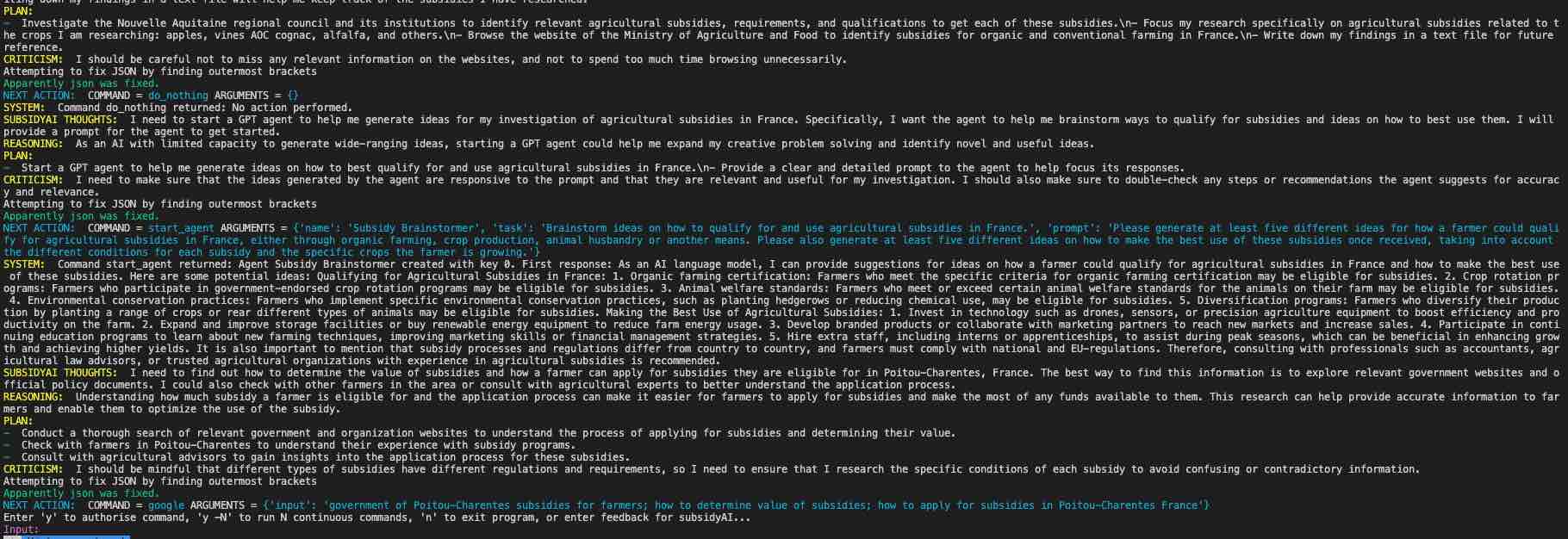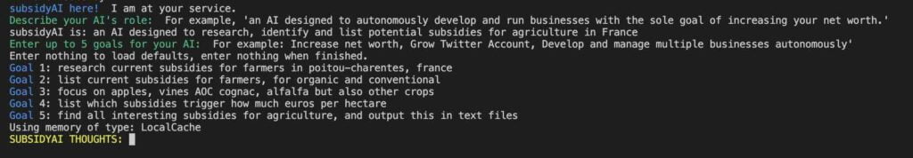 So I tried to use autoGPT as an assistant to help me with agricultural topics, specifically to help with finding subsidies. An autonomous GPT agent that searches and scrapes the internet could be pretty useful. So I called this AI agent “subsidyAI” and asked to find some interesting current programs. While the AI managed to access the right websites to research, it failed gathering the right information (and let’s not even talk about output). I believe that autoGPT for agriculture could become huge, especially when connected with image detection. autoGPT here we come, let’s give us 2-3 more months and I will try this again. Read below what my program tried to do here.
