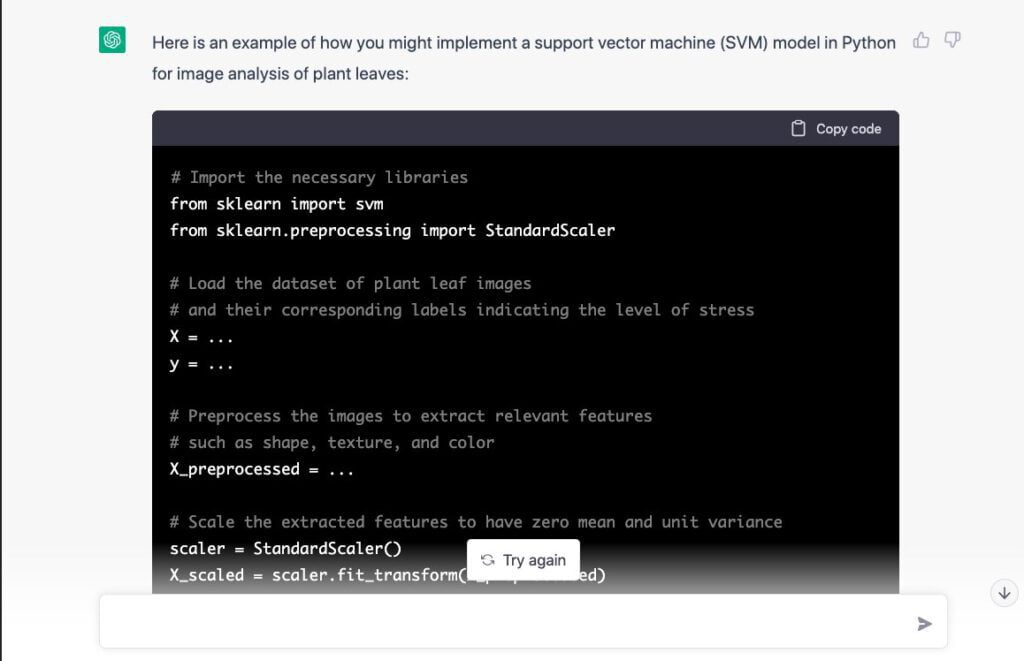 The user was testing chatGPT as a coding support (coding python with chatGPT works in an impressive way already even though it was not trained to do so) to implement a support vector machine SVM model in python for image analysis of plant leaves.