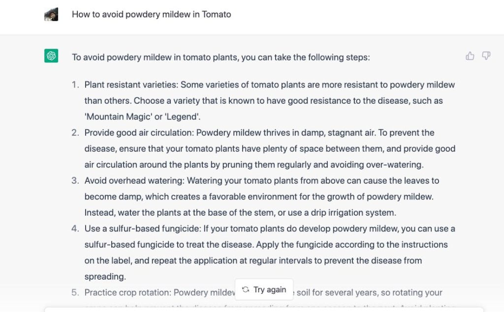 Tomato pest control, both question as text and python code for image detection: Another very specific question in the field avoid powdery mildew with Tomatoes: Shailendra singh @srj0408 writes on Dec 10, 2022: Tried ChatGPT today with questions around #agritech and the results were awesome. #agriculture #chatgpt3 #ChatGPT #OpenAI #OpenAIChatGPT #startup