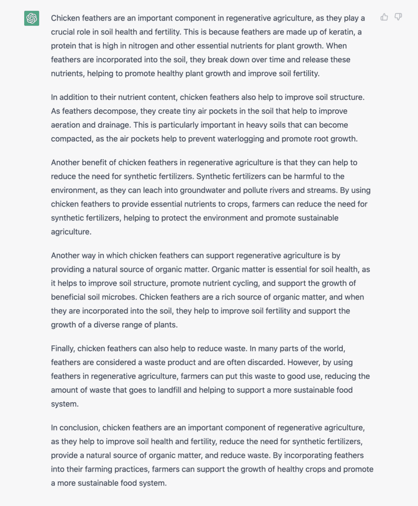 - Another nice example I found is on**regenerative agriculture in vineyards: wine thinker aka post.news/robertjoseph @robertjoseph writes on Feb 5 2023: How many of you know about the use of chicken feathers in viticulture? @SpierWineFarm uses them And #Chatgpt explains some reasons why I asked it to “Write an essay about the role of chicken feathers in regenerative agriculture”* I have asked the Spier Wine Farm via twitter if the essay is more or less accurate, so let’s see about that.