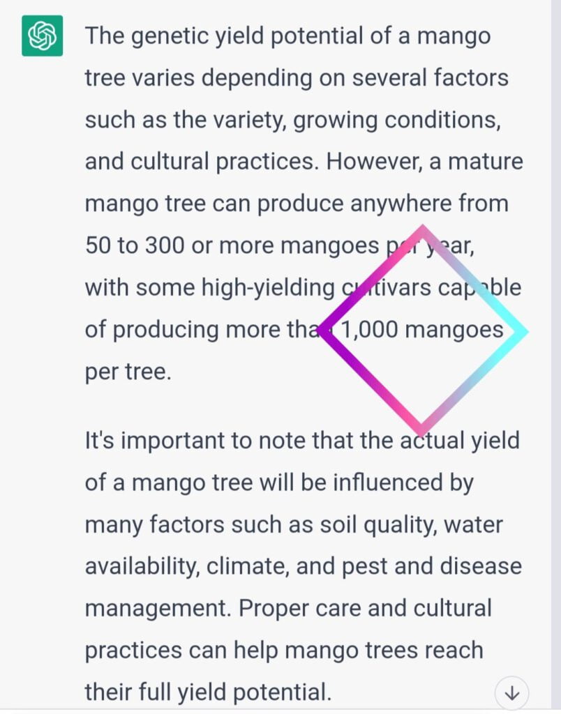 - Yield estimation & the Mango case**: Vishnu Sankar asked Feb 11: Got varying answers for the genetic yield potential of mango and the yield gap from the actual. So, checked with ChatGPT. Mangoes #Mango cultivation #UHDP #Farming #Agriculture #Fruits #Orchard* The language model predicts that a mango tree can produce between 50-300 mangoes per year per tree, with high-yielding trees that can produce up to 1,000 mangoes per tree per year.