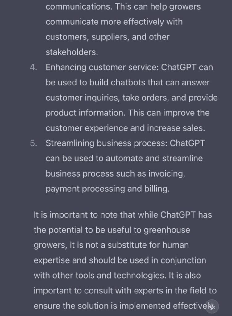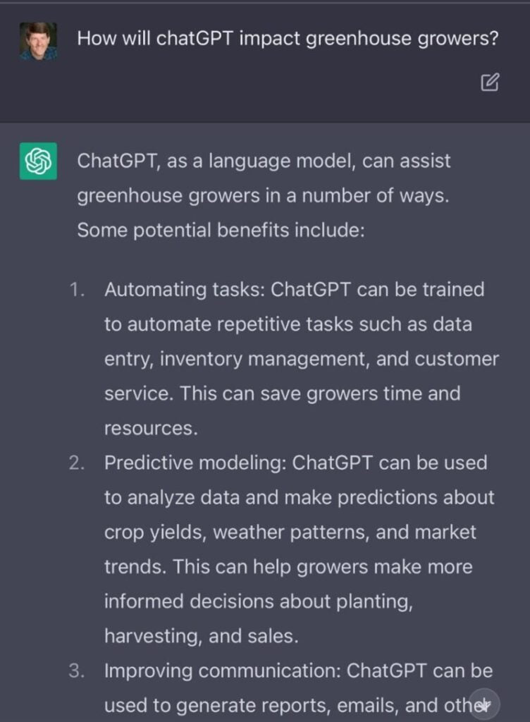 - Not a specific example, but interesting that it was brought up by greenhouse & data specialist John Beauford: How chatGPT may impact the horticulture industry: ChatGPT can be of great assistance to horticulture growers by providing an advanced and integrated technology system for their greenhouses.