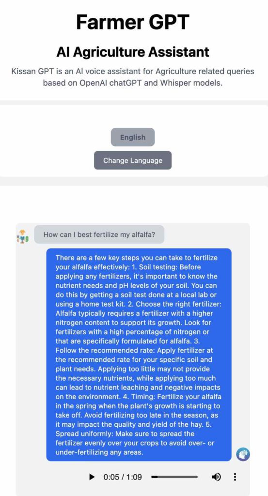- This side project, named Farmer GPT, uses ChatGPT and Whisper to provide valuable assistance to farmers in India. It helps them improve farming practices, yield, and profitability by providing real-time weather information, personalized crop recommendations, and peer-to-peer communication with experts and other farmers. This kind of AI assistant has the potential to replace agronomists, revolutionize farming practies in India by leveraging the power of AI and secure messaging to help farmers succeed in a competitive industry.
