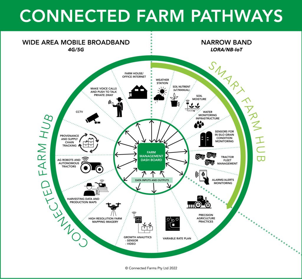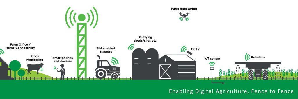 So basically, farm connectivity actually enables all levels of agtech and autonomous smart farming applications across the farm operation: Data usage, data-intensive robots and more intensive precision farming functions. Providing connectivity to the farmhouse, farm office, and outlying sheds on the estate.