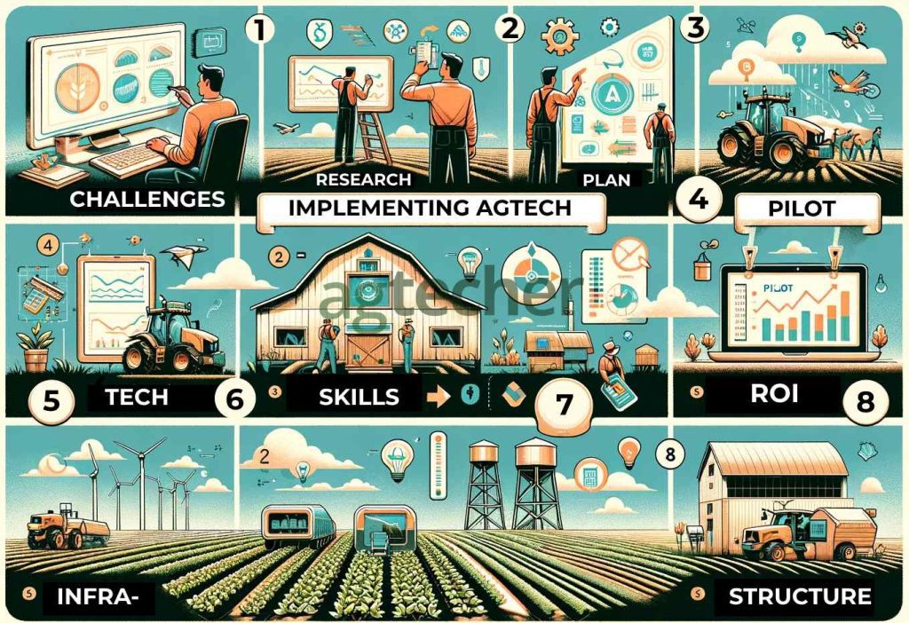 Step****Description**Assess Your Farm’s Biggest ChallengesPinpoint the top problems inhibiting productivity like labor shortages, weather variability, disease outbreaks or low yields. This focuses technology investments on priority pain points.Research AgTech Solutions Addressing Those ChallengesSearch tools tailored to your needs. For example, farms seeking to conserve water could explore soil moisture sensors, aerial mapping or irrigation automation technologies.Start Small With Pilot ProgramsTest potential AgTech on a limited scale before expanding deployment. Calibrate solutions to your farm’s conditions. Small pilots allow learning before major investments.Review Return on InvestmentWeigh if the benefits realized from your pilot AgTech projects warrant full adoption. Calculate the payback period for scaling up investments based on savings achieved already.Develop Staff Skills Alongside TechnologyEnsure your team gains skills to utilize new technologies through vendor training programs and community college courses. Complement technology with human capabilities.Design Infrastructure to Enable AgTechAudit your connectivity, electrical systems, and facilities. Upgrade infrastructure like high-speed internet where needed to fully leverage cutting-edge solutions.
