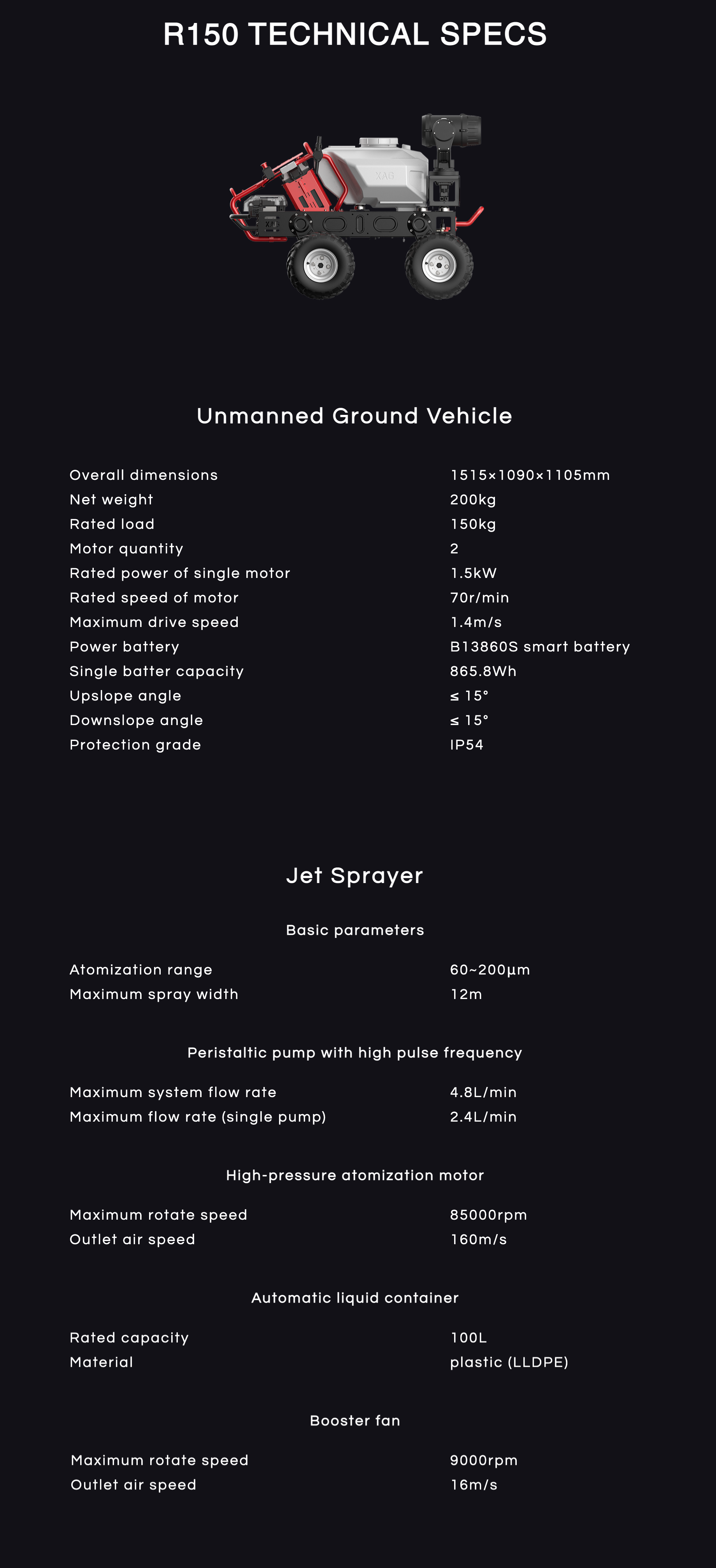The XAG R150 Unmanned Ground Vehicle is the ultimate solution for the next-generation of farming with unmanned systems. This is the first mass-produced agricultural robotic platform of its kind that provides industry-leading ground-based autonomous solutions perfect for precision crop protection, field scouting, and on-farm material delivery. The XAG R150 is designed with a powerful scalability and multiple operation modes, offering unmanned operations with smart control, one system for multiple jobs, a modular and extensible design, and optional payload systems.