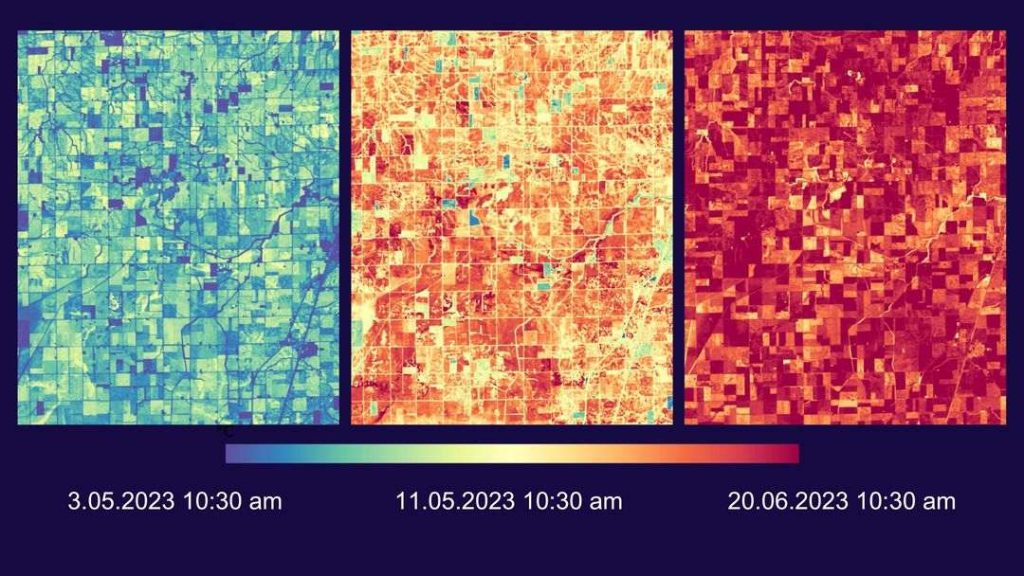 - Land Surface Temperature Data: 30 m resolution, enabling detailed monitoring at a sub-field level.