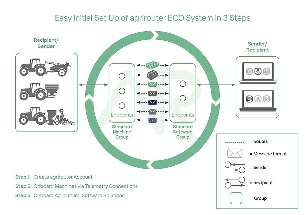 Unlike farm management software, Agrirouter is a web-based tool that functions like a postal service or shipping company, but for data. It allows for easy data exchange between machines and software solutions used on your farm or with your agricultural contractor. Agrirouter operates independently of manufacturers, and you alone determine who receives which data and when.